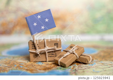 Flag of the Federated States of Micronesia. International Shipping and Postal Packages: Small Brown Parcels with Address Labels on World Map Background and Blue Flag with Stars