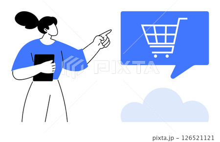 Woman holding tablet points to shopping cart symbol inside blue speech bubble. Ideal for online shopping, e-commerce, digital marketing, retail, promotions, customer service, user experience. Line