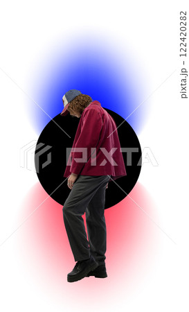 Young man in red jacket and cap standing against dark circle on white background and colorful gradient.