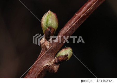 自然 植物 ミツバウツギ、芽吹き。三月半ば、二枚の芽鱗を割って緑色の若葉が顔を出しました