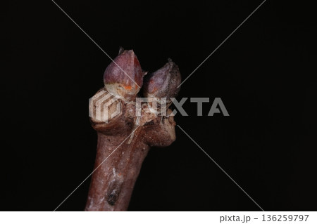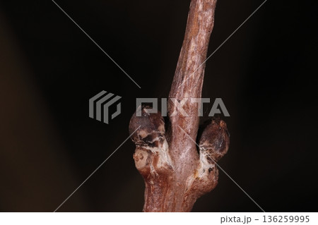 自然 植物 ミツバウツギ、冬芽です。枝も冬芽も茶褐色で地味な姿、冬芽はペアでつくようです