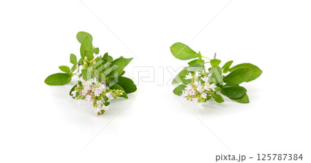 Fresh thyme twig isolated, fresh marjoram leaves, oregano sprig, green thyme seasoning leaf, thyme leaves