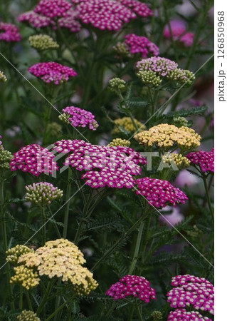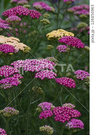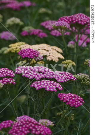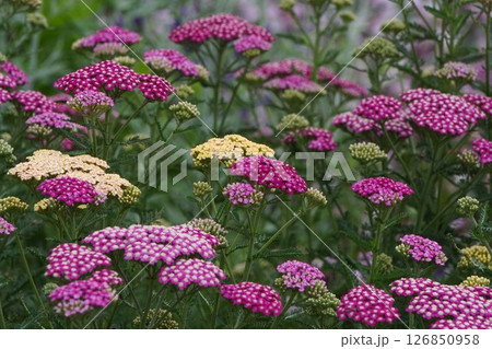 Pink Yarrow blooms, Achillea Millefolium plants in field