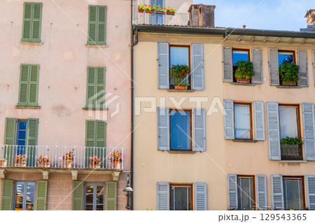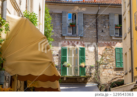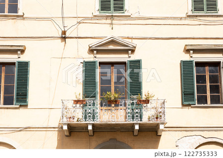 Multicolor windows balcony with shutters. Italy empty narrow street in summer day. Italian style facade architecture