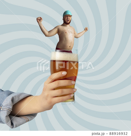 Contemporary art collage. Funny man in swimming cap standing inside foamy lager beer glass isolated over light blue background