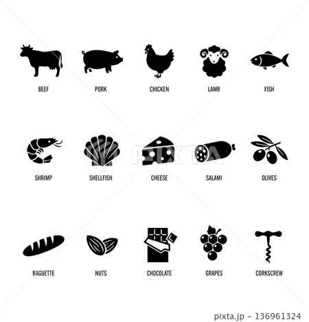 ワインに合う食材と料理のアイコンセット(牛、豚、チーズ、おつまみなど)