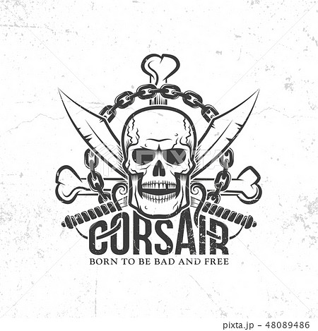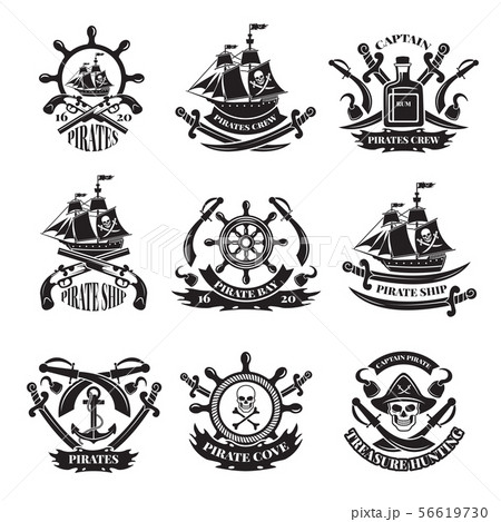 Pirate skull, corsair ships, symbols of piracy. Monochrome labels set