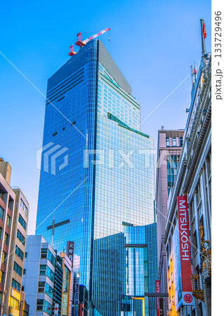 日本の東京都市景観12月23日。日本橋一丁目の再開発事業や三越などを望む。新時代へ