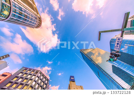 日本の東京都市景観夕日を浴びる日本橋の摩天楼や日本橋一丁目の再開発事業などを望む。新たな時代へ