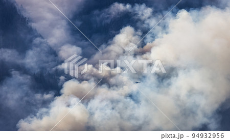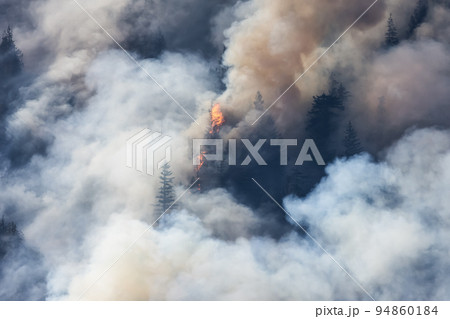 BC Forest Fire and Smoke over the mountain near Hope during a hot sunny summer day. British Columbia
