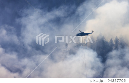 Wildfire Service Helicopter flying over BC Forest Fire and Smoke on the mountain near Hope
