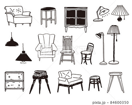 白黒、モノトーン、線画のイラスト(手書き、ファッション、インテリア、シンプル)