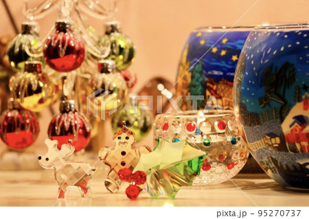 クリスマスのイメージ テーブルに飾られたクリスマスツリーやジンジャークッキーにトナカイのガラスの雑貨