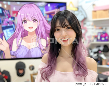 動画を撮影する女性のVtuberとディスプレイに映っているアバターのバーチャルYouTuber_3