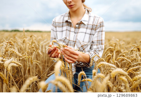 Agronomist holds ears of wheat, check quality of wheat grain. Agriculture food industry.