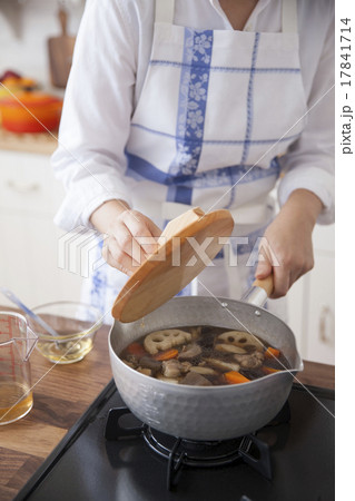 鶏肉と野菜を炒めた鍋に出汁を入れる女性