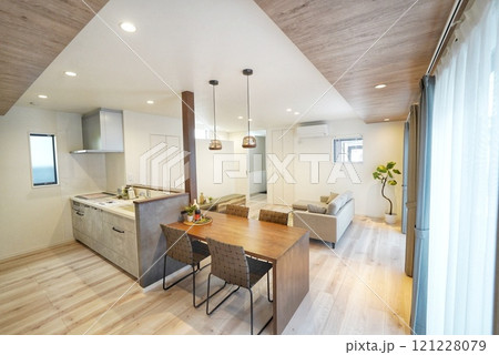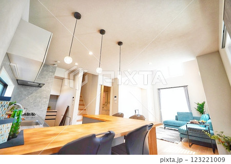 ダイニングテーブルとキッチンのカウンターが一緒になったカフェ風の新築住宅