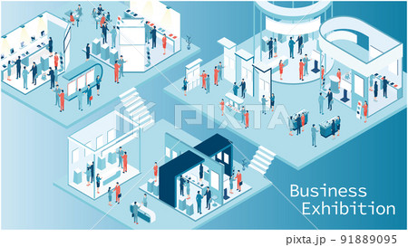 たくさんの来場者で溢れるビジネス展示会イベントのアイソメイラスト