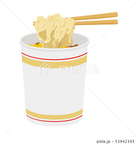 カップ麺のイラスト。コンビニで売ってるインスタントラーメン。箸で麺を食べる。