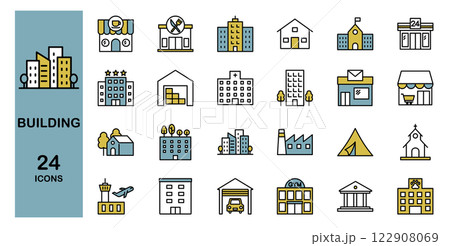 いろんな建物のアイコンセット ビル 家 マンション オフィス 工場 ショッピングモールなど カラー