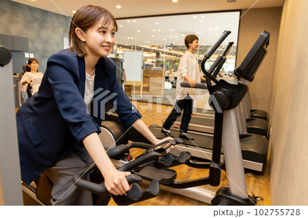 フィットネスジムで普段着でトレーニングをする若い女性 コンビニジムイメージ