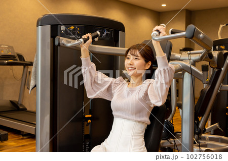 フィットネスジム 普段着でパーソナルトレーニングをする若い女性 コンビニジムイメージ