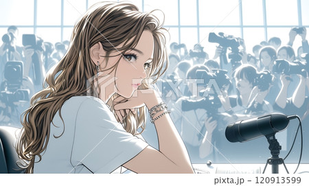 取材陣から共同インタビューを受けている若い女性(タレント)