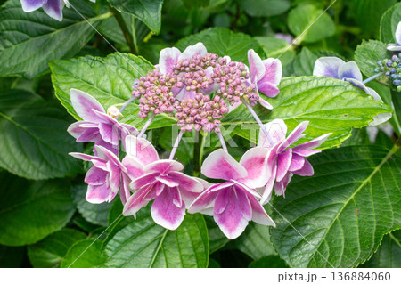 薄紫色のグラデーションカラーに咲くコンペイトウ種の手毬アジサイの花 (クローズアップ接写)