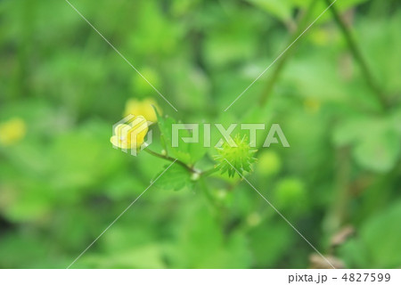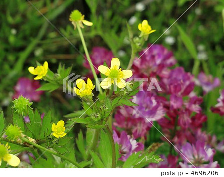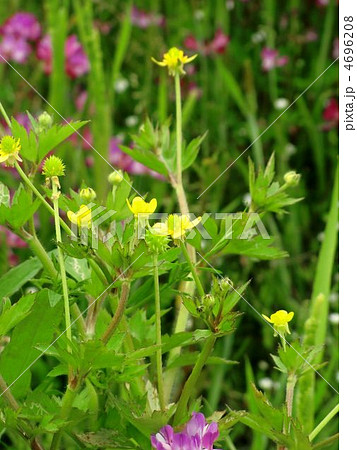 春の野の草・レンゲソウに押され気味に春の田の端に咲いているキツネノボタンの花と若い実・横位置