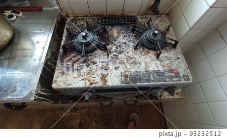炊飯器と油汚れのコンロがある汚れたキッチン