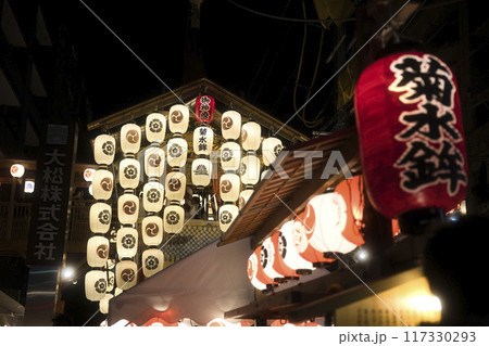 祇園祭 宵山の暗闇に浮かび上がる駒形提灯 横構図 放下鉾1