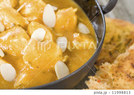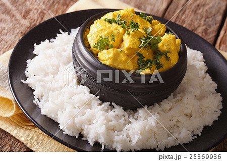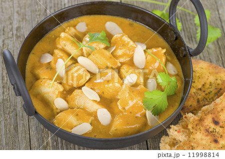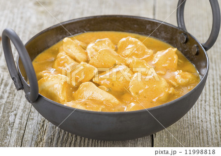 Chicken Korma - Chicken on a mildly spiced creamy sauce on a wooden background. Indian cuisine.