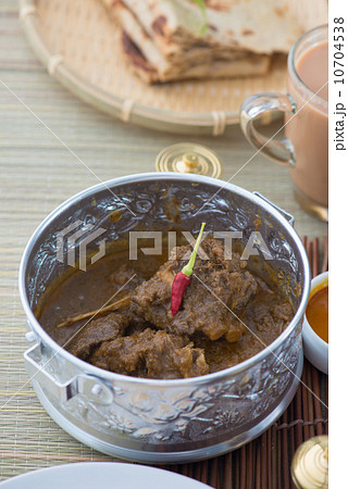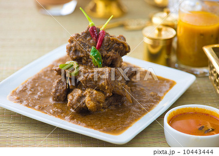 INDIAN FOOD. ROGAN JOSH curry sauce. Pork rogan josh with rice and naan bread