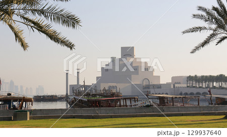 カタール・ドーハ イスラム美術館と伝統的なダウ船の風景
