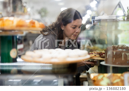 Young woman waiter laying out cupcakes on counter