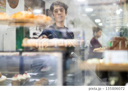 Barista guy standing near counters with food tray