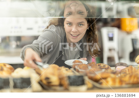 Woman works as a waiter in a coffee shop and puts cakes and desserts
