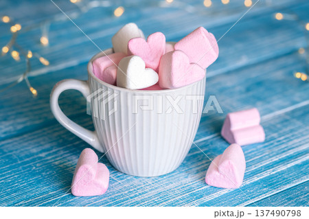 A cup with heart-shaped marshmallows, close-up on a blue wooden background.