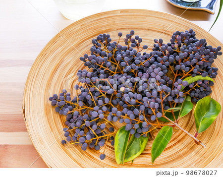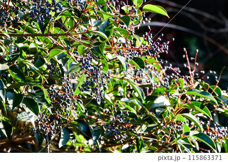 黒い丸い実をたわわに付けたトウネズミモチ