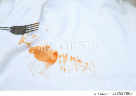 dirty barbeque sauce stain on cloth from daily life activity for cleaning concept. housework care living life of people