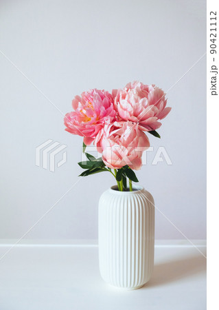 White and pink peonies in a metal vase. Beautiful peony flower for catalog or online store. Floral