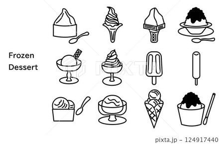 一筆書き アイスクリームとソフトクリームとかき氷(白黒、モノクロ)