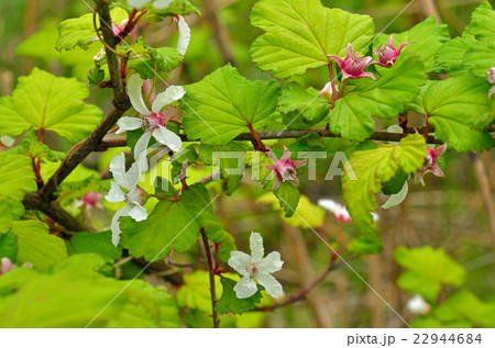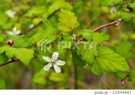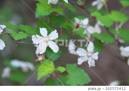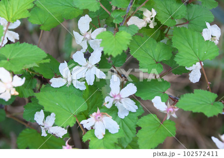 自然 植物 ニガイチゴ、咲いたばかりの花は中心まで白い。花弁にシミもなく美しい
