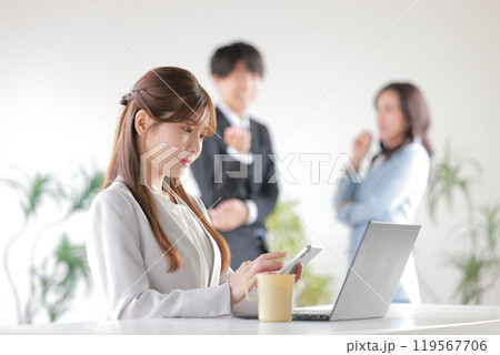 デスクワークする女性と女性の噂話をするビジネスパーソン_1