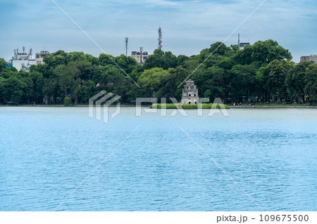 ベトナム ハノイのホアンキエム湖内のゴックソン島に建つ寺院玉山祠から見た亀の塔