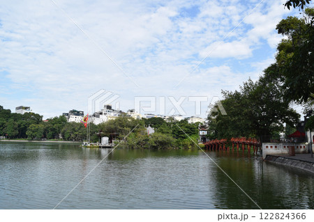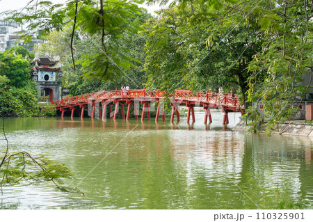 ベトナム ハノイのホアンキエム湖内のゴックソン島に建つ寺院玉山祠への赤い橋