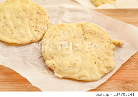 Three slices of yeast-free bread on dietary lavash with sesame seeds texture background