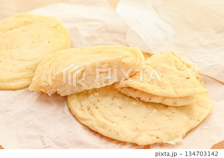 Thinly sliced homemade bread on the surface of yeast free lavash with grains