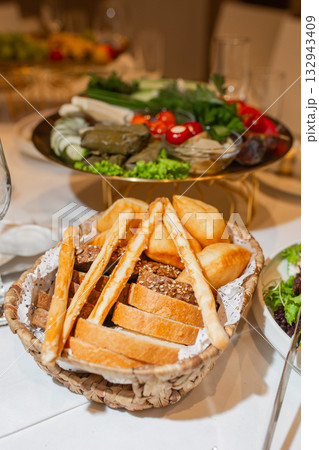 Rustic bread basket with assorted loaves and baguettes beside vegetable platter