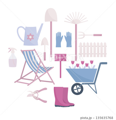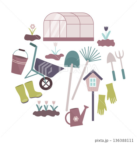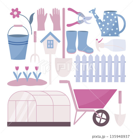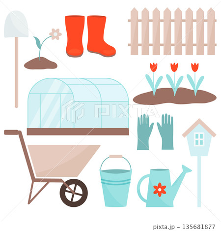 Garden tools. Flowers for planting, seeds, seedlings. Gardening clothes. Vector illustration on a white background.